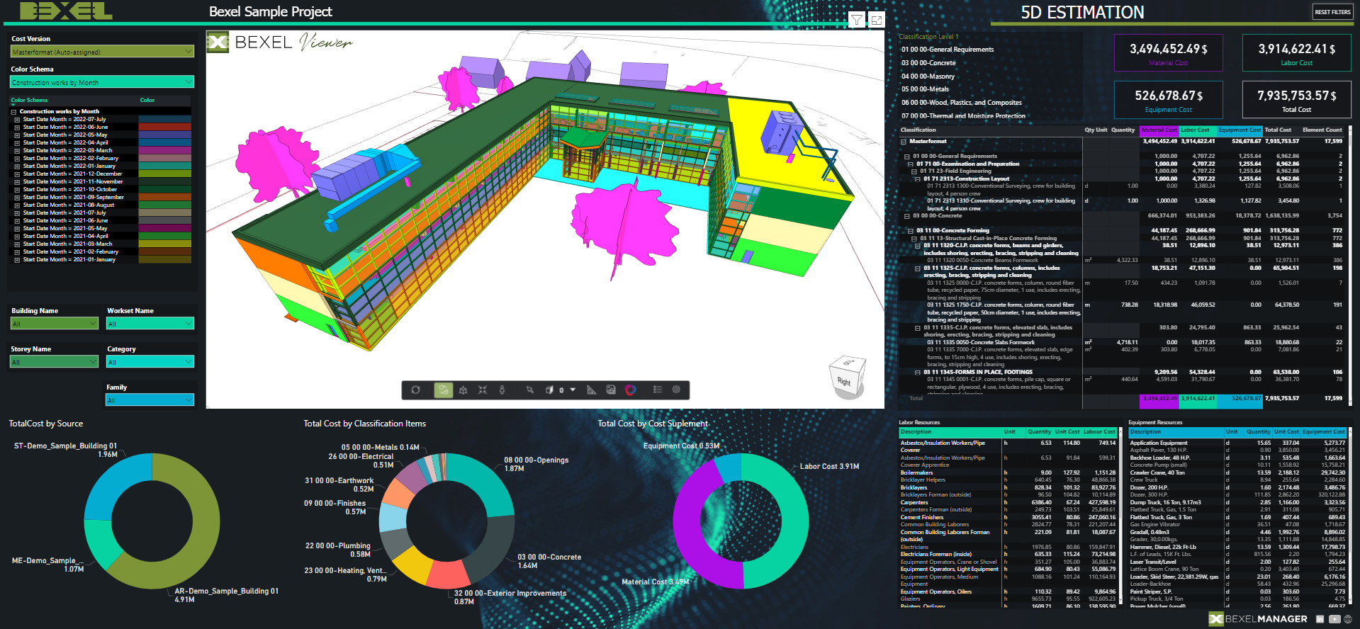 4D/5D BIM მოდელის სრული პოტენციალის გამოყენებით, BEXEL Manager ქმნის და ოპტიმიზაციას უკეთებს მონაცემებით გამდიდრებულ სამშენებლო გრაფიკებს, რომლებიც მოიცავს თითოეული ამოცანის ხარჯებსა და მოცულობებს. ეს უზრუნველყოფს დეტალურ სამშენებლო დაგეგმვას, ზედმეტი სამუშაოების აღმოფხვრას და დამღლელი აქტივობების თავიდან აცილებას. სამშენებლო გრაფიკისა და BIM მოდელის ელემენტების კავშირი BEXEL Manager-ში იძლევა მომენტალურ სამშენებლო სიმულაციებს.